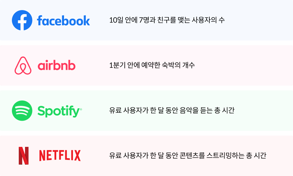 ์ด์ฒ๋ผ ๋ถ๊ทน์ฑ ์งํ๋ ๋ฆฌํ ์ , ์๊ฐ ์์ต, ARPU ๋ฑ ํ์ฌ์ ํต์ฌ ๊ฒฐ๊ณผ๊ฐ์ ๋ฌ์ฑํ๊ธฐ ์ํ ํต์ฌ ์ก์ ์ด๋ค. ๊ทธ๋์ ์ด๊ฑธ ์ฐพ์๋๊ฐ๋ ๋ฐฉ์์ 'A-ha moment'๋ฅผ ์ฐพ๋ ๋ฐฉ์๊ณผ๋ ์ ์ฌํ๋ค. ์ด์ ์ ๋ง์ถฐ์ผ ํ ๊ณณ์ ํ๋์ ์ ๋ํ๋ค. ๋น์ ์๋น์ค์ ๋ฌด์จ ๊ธฐ๋ฅ์ ์ด๋ค ๊ธฐ๊ฐ ์์ ๋ช ๋ฒ ์ฌ์ฉํ๋ ์ฌ๋๋ค์ ํ์ฑ ์ฌ์ฉ์๋ก ์ ์ํ ์ ์๋๊ฐ? ํ์ด์ค๋ถ์์๋ 10์ผ ์์ 7๋ช ๊ณผ ์น๊ตฌ๋ฅผ ๋งบ๋ ์ฌ์ฉ์ ์๋ฅผ, ์์ด๋น์ค๋น๋ 1๋ถ๊ธฐ ์์ ์์ฝํ ์๋ฐ์ ๊ฐ์๋ฅผ, ์คํฌํฐํ์ด๋ ์ ๋ฃ ์ฌ์ฉ์๊ฐ ํ ๋ฌ ๋์ ์์ ์ ๋ฃ๋ ์ด ์๊ฐ์ ๋ถ๊ทน์ฑ ์งํ๋ก ์ ์ํ๊ณ ์๋ค.