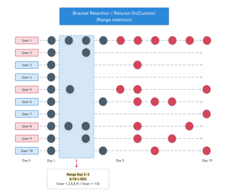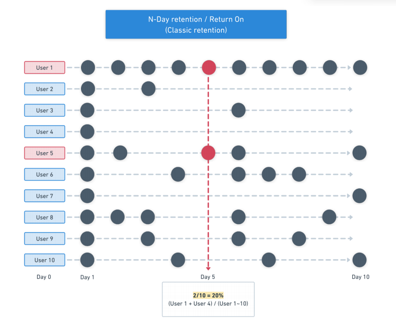 ํด๋์ ๋ฆฌํ ์ Classic retention์ N-Day retention์ผ๋ก ๋ถ๋ฆฌ๊ธฐ๋ ํ๋ฉฐ ์ธก์ ๋์์ด ๋๋ '๊ทธ๋ ' ๊ธฐ์ค์ผ๋ก ์ ์ฒด ๋๋น ๋ค์ด์จ ์ฌ๋์ ๋น์จ์ ๋ฐ์ง๋ ๋ฆฌํ ์ ์ด๋ค. ์ผ๋ฐ์ ์ผ๋ก ์๋ฌด๋ฐ ์์์ด ์์ด ๋ฆฌํ ์ , ํ๋ฉด ํด๋์ ๋ฆฌํ ์ ์ด๋ค. ์ด ๋ฐฉ์์ ๊ฒ์์ด๋ ์์ ์ฑ์ฒ๋ผ ์ฌ์ฉ์๊ฐ ๊ท์น์ ์ด๊ณ ๋ฐ๋ณต์ ์ผ๋ก ํ๋ํ๋ ์๋น์ค์ ์ ์ฉํ๊ธฐ ์ ํฉํ๋ค.