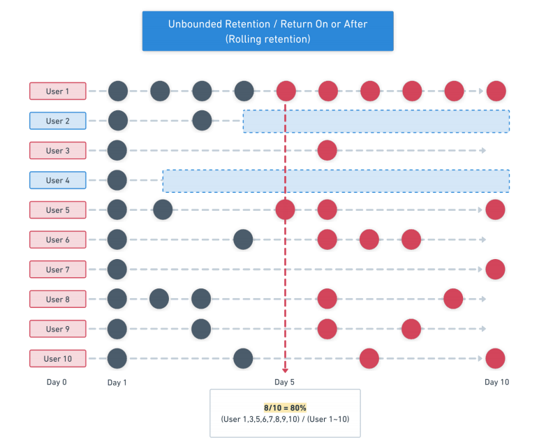 ๋กค๋ง ๋ฆฌํ ์ Rolling retention์ Unbounded retention์ด๋ผ๊ณ ๋ ๋ถ๋ฆฌ๋ ๋ฆฌํ ์ ์ด๋ค. ์ด ๋ฆฌํ ์ ์ ํน์ ์ผ์ ์ดํ๋ถํฐ ํด๋น ์ก์ ์ ํ๋ ๋ชจ๋ ์ ์ ๋ฅผ ์ทจํฉํด ๋น๊ตํ๊ธฐ ๋๋ฌธ์ ์ ์ ์ ์ง์จ๋ณด๋ค๋ ์ ์ ์ดํ์จ์ ํ์ ํ๋ ๋ฐ ๋ ๋์์ด ๋๋ค. ๊ทธ๋์ ๋กค๋ง ๋ฆฌํ ์ ๋ฐฉ์์ ์ ์ ๊ฐ '๋งค์ผ ์ด์ฉํ์ง ์๋ ์๋น์ค', ์์ ์ธ๊ธํ๋ ๊ฒ์ผ๋ก ๋งํ์๋ฉด ์์ด๋น์ค๋น๋ ๋ทํ๋ฆญ์ค ๋ฑ์ ์๋น์ค์ ๋ฐ์ํ๊ธฐ์ ์ ํฉํ๋ค. ๋ค๋ง ์ด ๋ฐฉ์์ ๊ณ์ ์ ์ค๋ค๊ฐ ์ธก์ ์ผ์ ์ดํ์ ๋ค์ด์์ ํต์ฌ ์ก์ ์ ์ํํ ์ ์ ๊ฐ ์๊ธฐ๋ฉด ๊ธฐ์กด์ ์ธก์ ํ๋ ๋ฆฌํ ์ ์ด ๋ณํ ์ ์๊ธฐ ๋๋ฌธ์ ๋ณด๊ณ ์ ์ ์ํ ํ์๊ฐ ์๋ค.