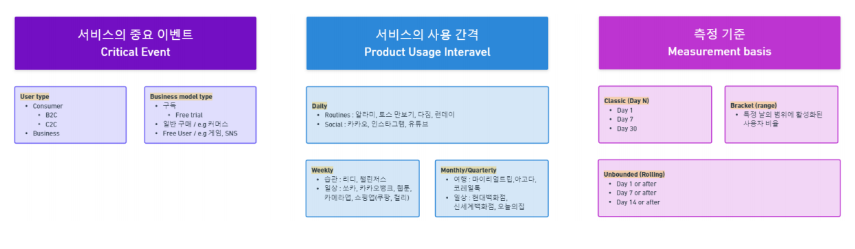๊ทธ๋ฌ๋ฉด ์ฐ๋ฆฌ ์๋น์ค์ ๋ง๋ ๋ฆฌํ ์ ์ ์ด๋ป๊ฒ ์ค์ ํ ์ ์์๊น. ์ฃผ์ ์ด๋ฒคํธCritical Event, ์๋น์ค ์ฌ์ฉ ๊ฐ๊ฒฉProduct Usage Interval, ์ธก์ ๊ธฐ์คMeasurement basis ์ธ ์ธก๋ฉด์์ ๊ณ ๋ คํ๋ค๋ฉด ๋นํ ์๋ ๋ฆฌํ ์ ์งํ๋ฅผ ๋ง๋ค ์ ์๋ค.