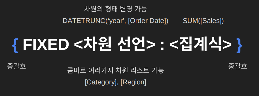 LOD ํํ์์ ์๋์ ๊ฐ์ ํํ๋ฅผ ๊ฐ์ง๋ค. ์กฐ๊ฑด์ผ๋ก ํ์ฉํ ์ฐจ์๊ณผ ์ง๊ณ์์ ๊ธฐ์ฌํ๊ณ ์ค๊ดํธ๋ก ๋ฌถ์ด ์ฃผ๋ ํํ๋ค. ์ฐจ์ ์ ์ธ์ ์๋ตํ ์ ์๋๋ฐ, ์๋ตํ๋ฉด ์ ์ฒด ํ