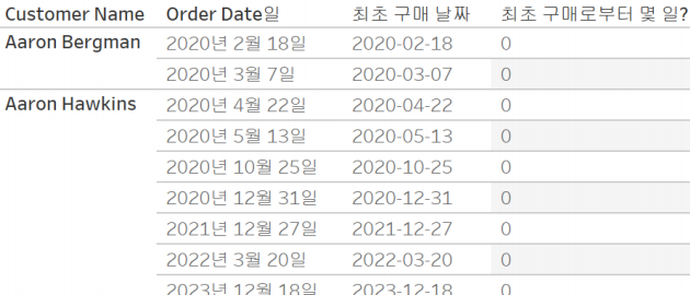 ์ด์ฉ๋ฉด ๋น์ฐํด ๋ณด์ด๋ ๋ง์ด์ง๋ง, ์ด ๋จ์ํ ์กฐ๊ฑด์ผ๋ก ์ธํด ์ ํ๋๋ ๊ณ์ฐ๋ค์ด ๋ง๋ค. ์๋ฅผ ๋ค์ด ๊ณ ๊ฐ๋ณ ๊ตฌ๋งค ์ผ์๋ฅผ ์ต์ด ๊ตฌ๋งค์ผ๋ก๋ถํฐ ๋ฉฐ์น ์ด ์ง๋ฌ๋์ง ๋ณด๊ณ ์ถ๋ค๊ณ ํด ๋ณด์. ์ด๋ฅผ ์ํด์ ๊ตฌ๋งค์ผOrder Date์ MIN ๊ฐ๊ณผ(MIN[Order Date]) ์ต์ด ๊ตฌ๋งค์ผ๋ก๋ถํฐ์ ๋ ์ง ์ฐจ์ดDATEDIFF๋ฅผ ๋ฝ์ผ๋ฉด ์๋์ ๊ฐ์ด ๋์ค๊ฒ ๋๋ค.